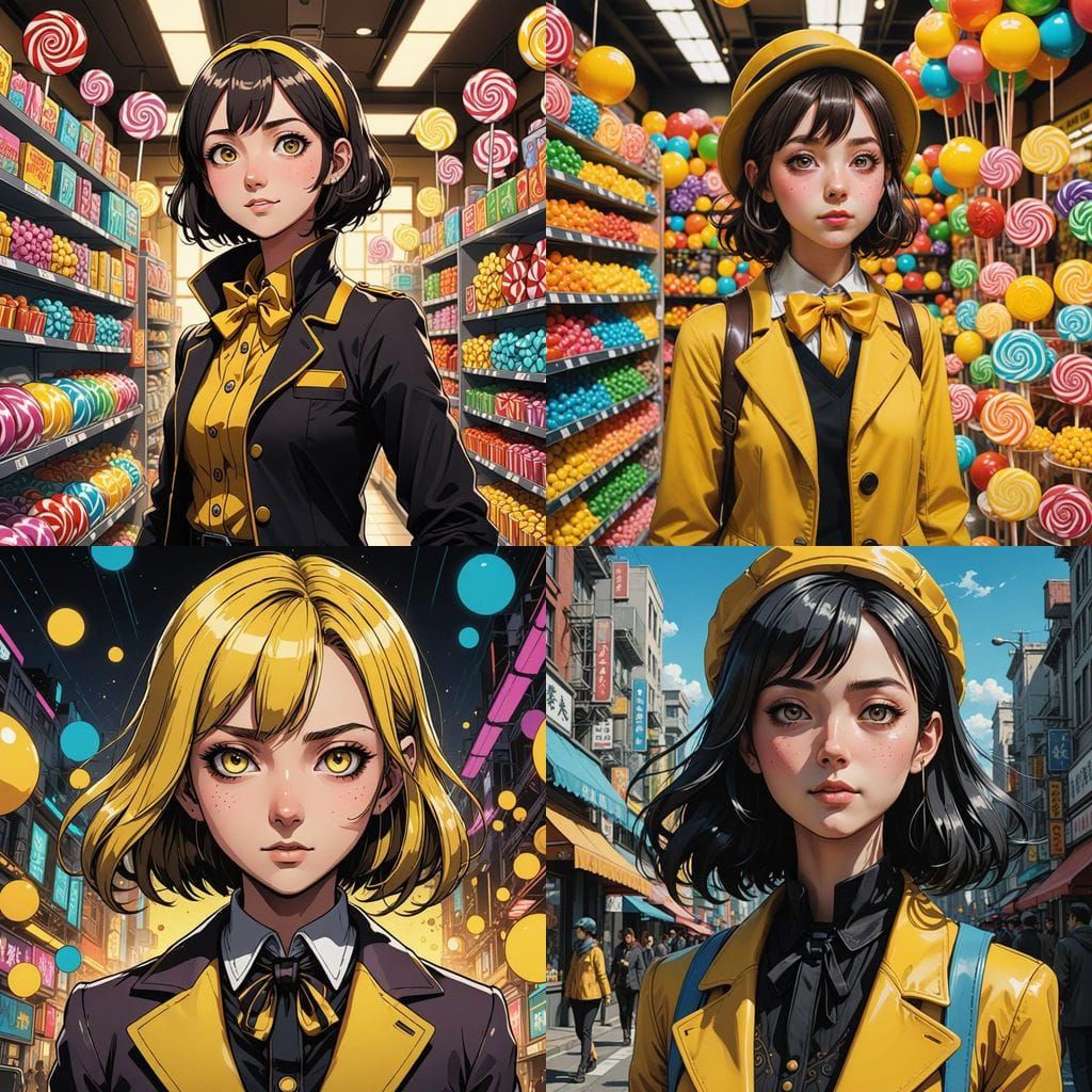 This anime-style artwork features a young Irish girl wearing a bright and bold Willy Wonka-inspired outfit, created with a mix of flat and cel-shaded techniques, evoking a cinematic feel.