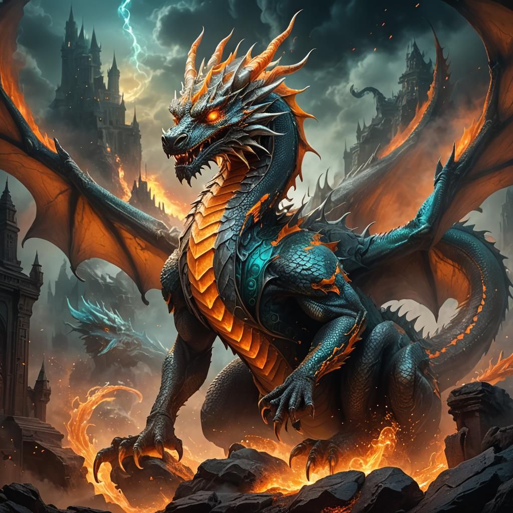 A striking picture of a majestic orange and silver dragon with deep eyes, set against a smoky backdrop. The fantasy art features glowing embers in a teal and orange color scheme, rendered in high contrast.