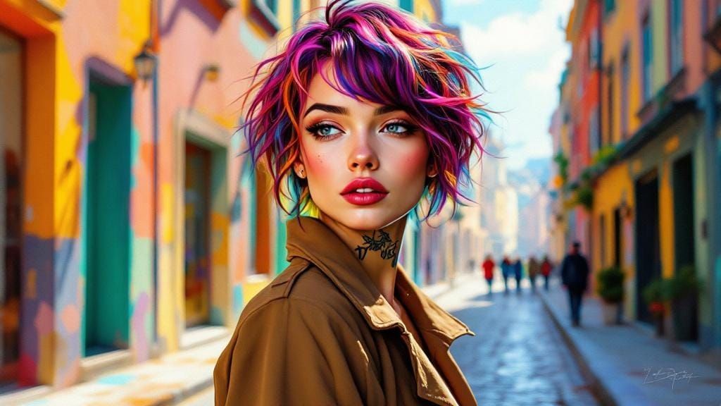 A vibrant image of a confident woman on a colorful European street. The scene evokes painterly textures and bold brushwork, reminiscent of vivid urban expressionism.