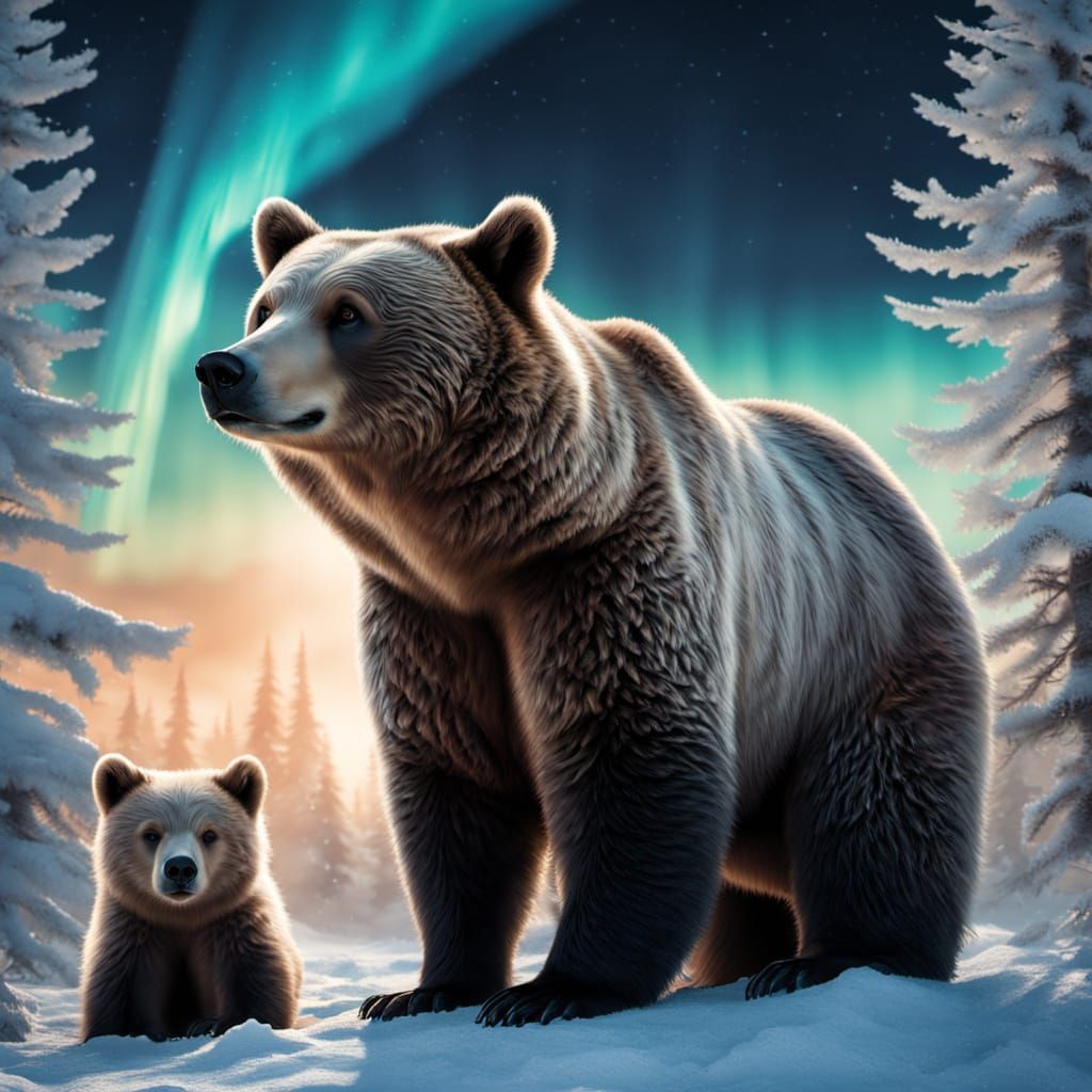 A hyperrealistic image captures a mother bear and her cubs settling into a den as snow falls. The aurora-lit sky and frosty pines create a serene, emotional scene.