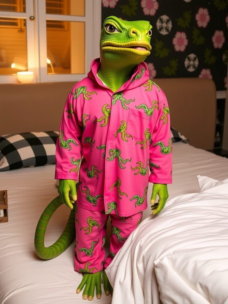 This image shows an iguana wearing funky nightwear. The AI generated this image based on a very short prompt. The iguana's outfit is vibrant and eye-catching.