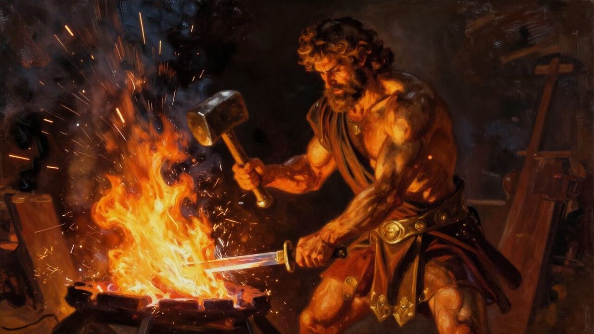 This image depicts Vulcan, the Roman god of fire, intensely hammering a dagger in a blazing forge. Created in a dynamic, bold impasto style with visible brushstrokes and dramatic chiaroscuro lighting.