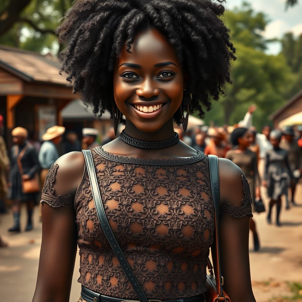 This image shows a smiling Black woman in 19th-century dress in Central Park. A vibrant village of Black people populates the background of this photorealistic and cinematic image.
