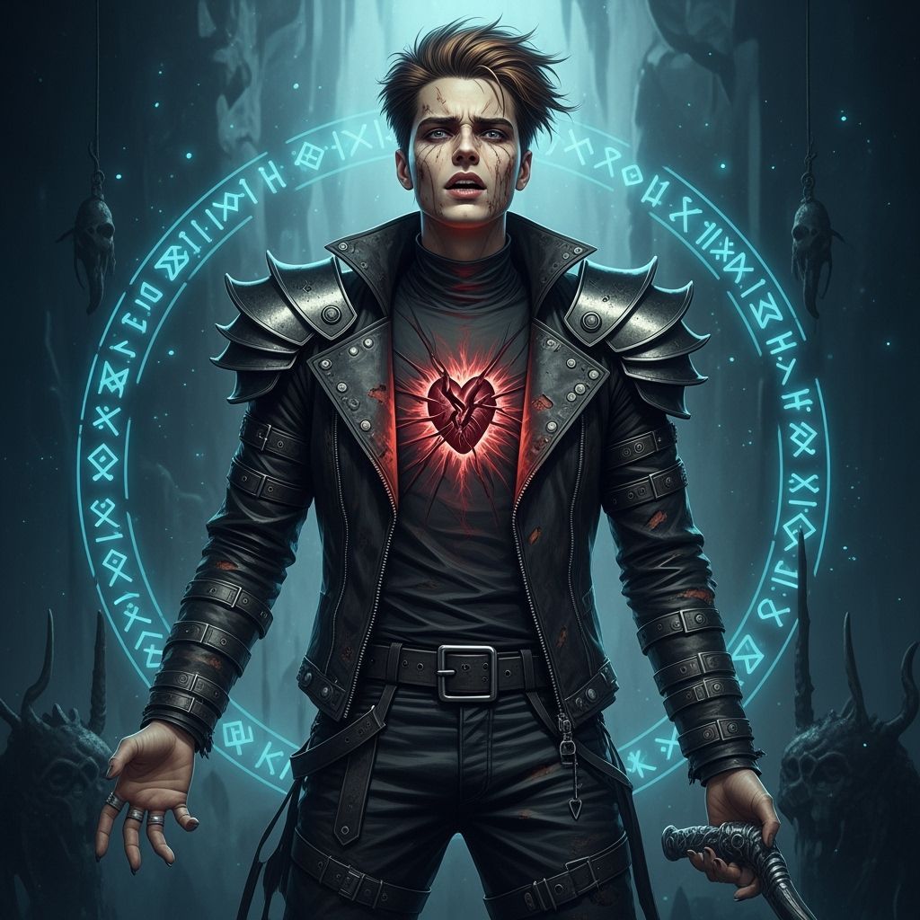 A sorrowful figure resembling Riven from Winx Club as a Cenobite stands in a mystical realm. The character, clad in black leather, appears anguished with a shattered heart, rendered with rich colors.