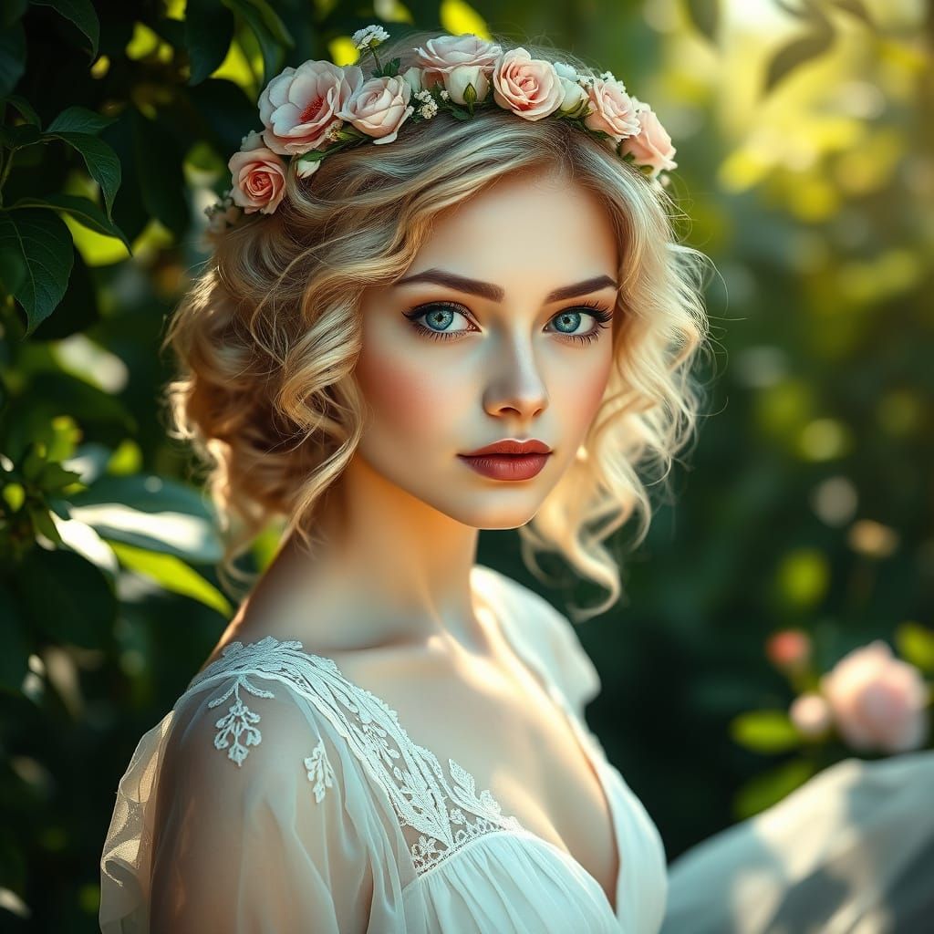 This image shows a beautiful young woman in a lush summer garden, surrounded by intricate details and soft focus. Her delicate features and romantic, ethereal quality evoke a fairy tale vibe, reminiscent of fantasy-infused realism and digital art.