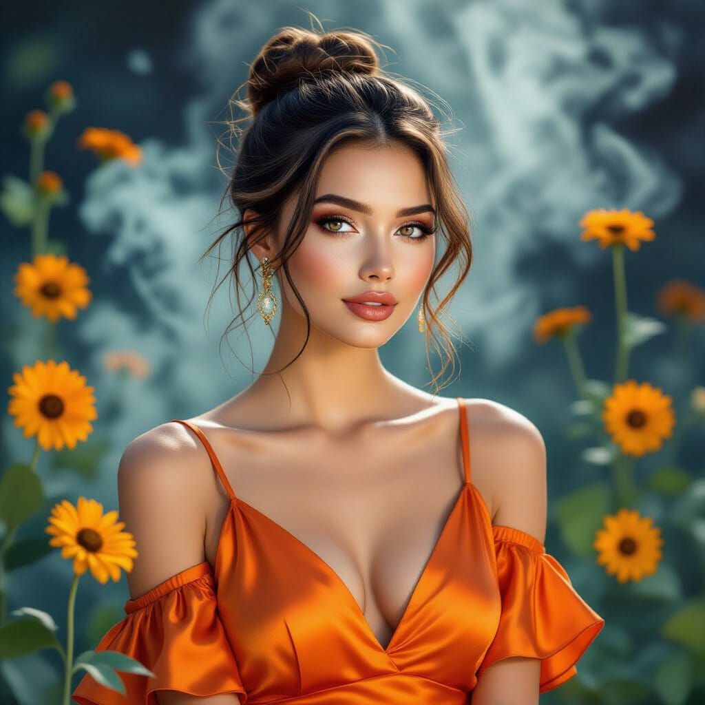 A striking picture of a beautiful Russian woman in an orange silk dress, her hair in a smooth bun. The image features hyperrealistic smoke effects and a blend of watercolor and acrylic textures, as digital art.