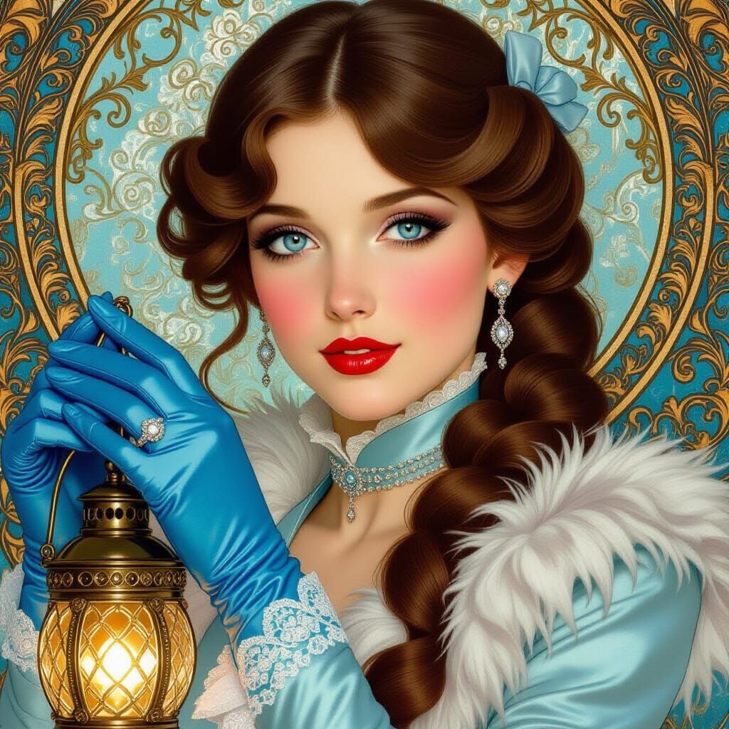 This image shows a close-up of a beautiful woman reminiscent of 19th-century portraiture, featuring lilac eyes and blue lipstick. Her elaborate hairstyle and satin suit are rendered with delicate, ornate details in an art nouveau style.
