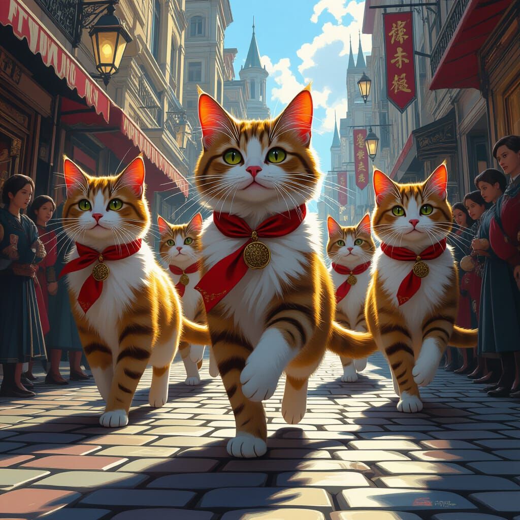 This image shows cats in red ties marching forward. The artwork features deep colors and intricate details, in a fantasy concept art style.