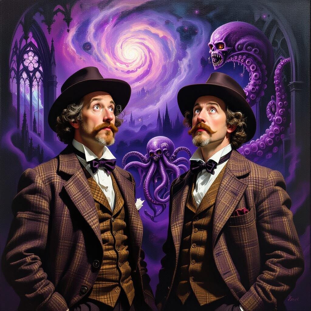 This image depicts two academics in tweed suits observing a tentacled entity among nebulae and Gothic architecture. Rendered in a Baroque style with deep violet and purple hues, dramatic lighting, and ornate detail.