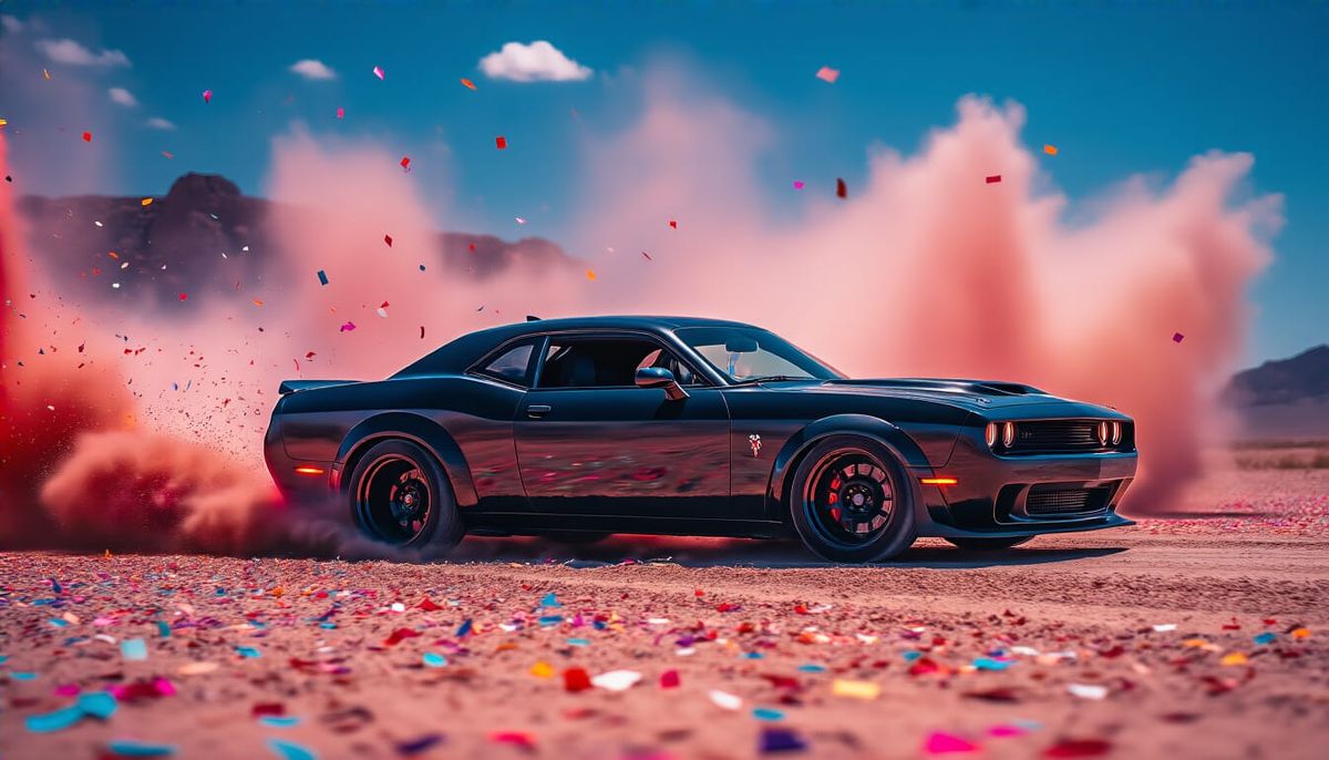 This hyperrealistic image showcases a modern muscle car with neon underglow and black chrome rims driving through a vibrant desert landscape filled with swirling confetti. HDR and cinematic lighting enhance the moody atmosphere.