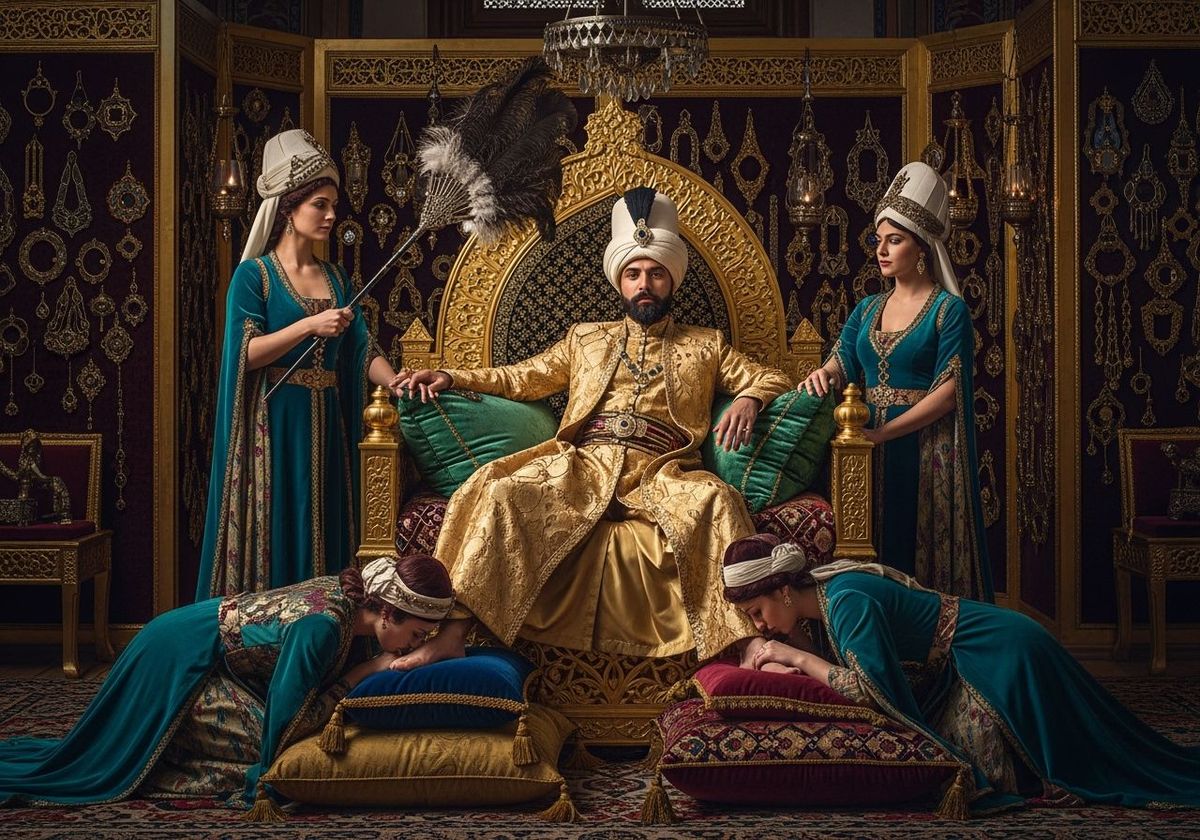 This image depicts an Ottoman Sultan in a gold silk kaftan, relaxing on a lavish throne in Topkapi Palace. Concubines attend to him in a scene filled with gold, jewels, and intricate detail, reminiscent of Ottoman miniature paintings.