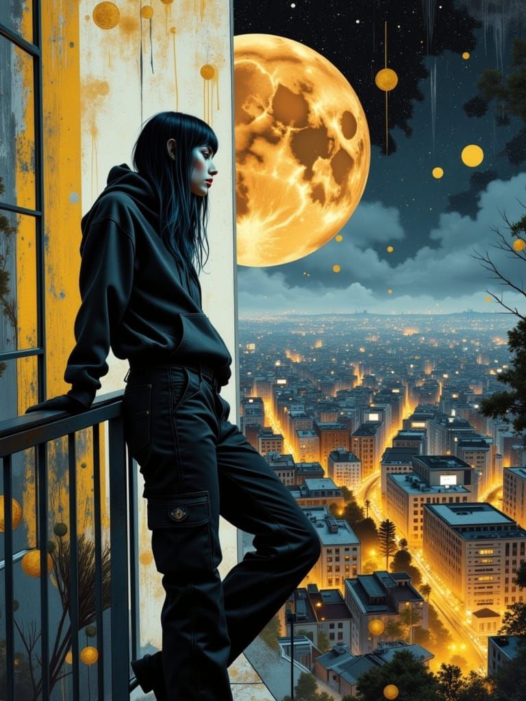 <lora:5E-FL:1.0> <lora:Collage Dream WC:1.0> Portrait of a woman, leaning on the railing of a balcony, looking over a dark, corbusian city, vast and sprawling, with lights sparking in the distance. hazy night sky that is lit up by the lights of the city. The woman has long cobalt and black hair, and ...