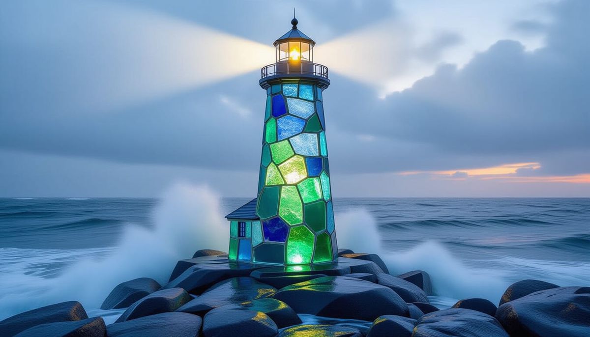 This image shows a majestic lighthouse built from smooth, colorful sea glass. It stands against a stormy sea at dusk, with its beam piercing the mist. The style is photorealistic, highlighting glass textures.