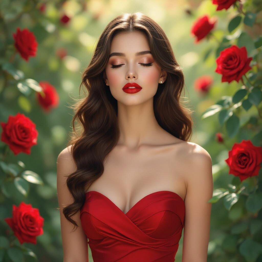 This image shows a woman with long brown hair in a red dress, in a rose garden. The art style evokes art nouveau with luxurious textures and a romantic atmosphere.