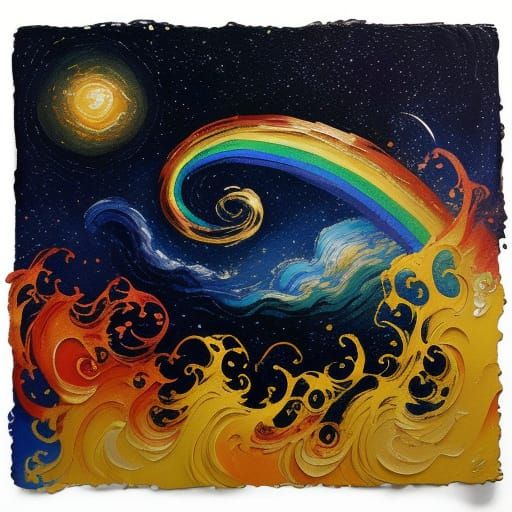 A vibrant rainbow glows against a dark sky filled with swirling clouds and stars. Rendered with expressive brushstrokes and warm lighting in the style of impressionist painting.