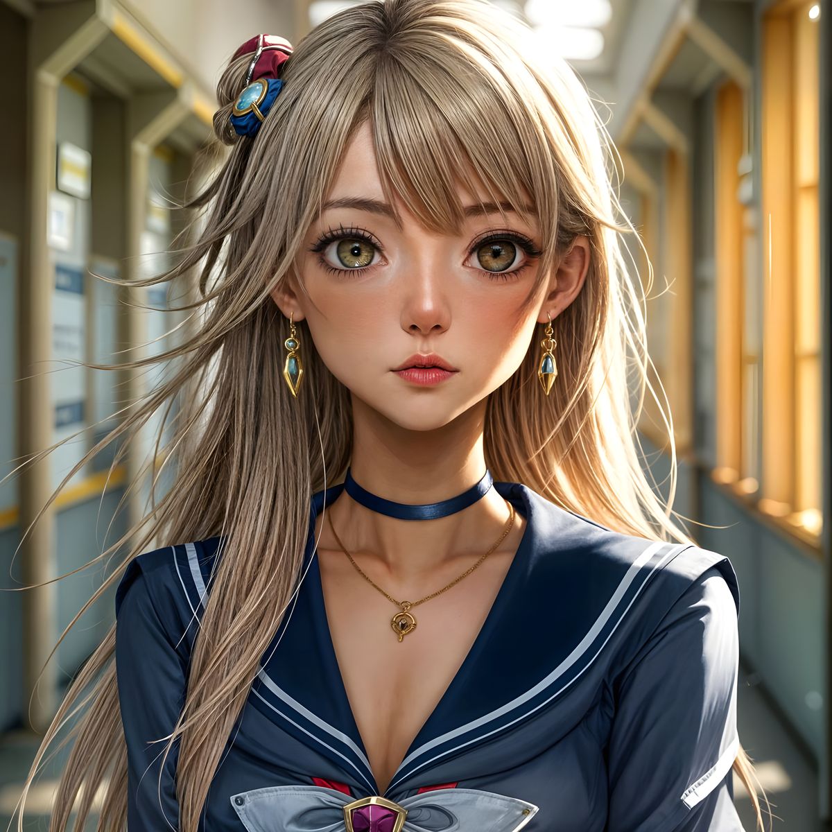 This image shows a young woman with long, blonde hair and brown eyes, wearing a Senshi uniform and jewelry. She is posed in a direct, confident manner, capturing the viewer's attention.