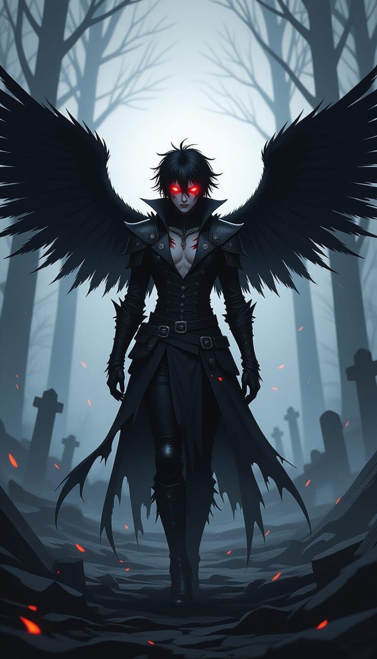 Easily generate your own dark fantasy anime characters with torn wings and glowing eyes. Free and simple AI art creation.