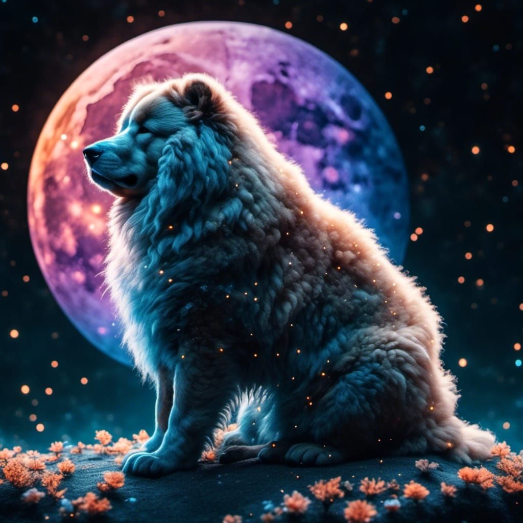 A hyperrealistic image of a Chow Chow dog gazing at the moon. The image features intricate details, cinematic lighting, and a vaporwave aesthetic with warm, triadic colors.