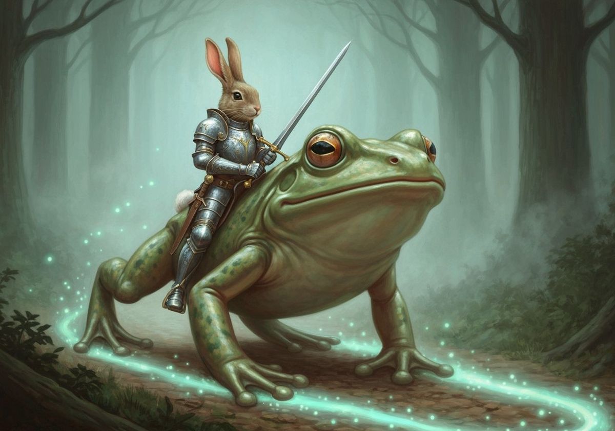 Fantastical scene of a rabbit knight riding a frog into battle!!