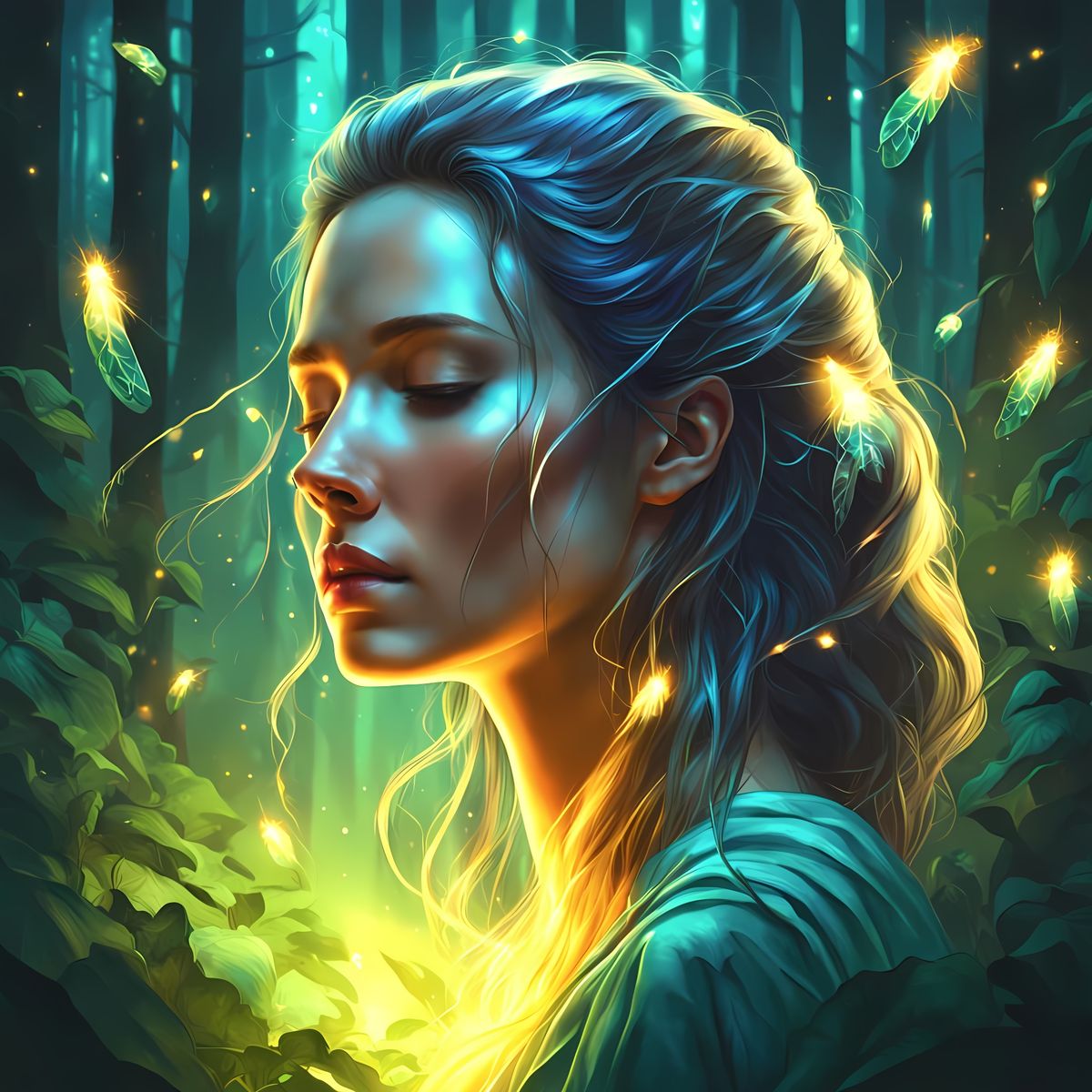 A surreal image of a woman meditating in a forest. She is surrounded by fireflies and glowing plants, painted with deep greens, blues, and gold hues, creating a tranquil, mystical, fantasy atmosphere.