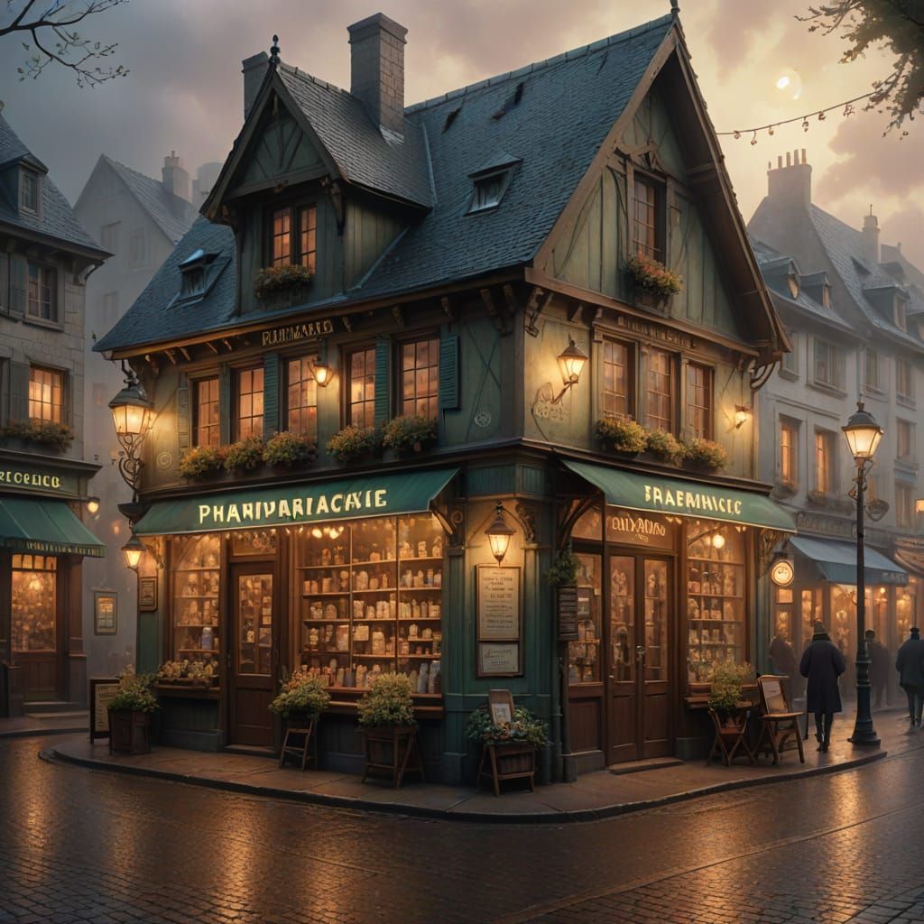 This image shows a vintage French pharmacy in a misty town. The scene features soft, glowing lanterns, delicate textures, and warm golden lighting, rendered with hyper-realistic, ethereal fantasy elements.