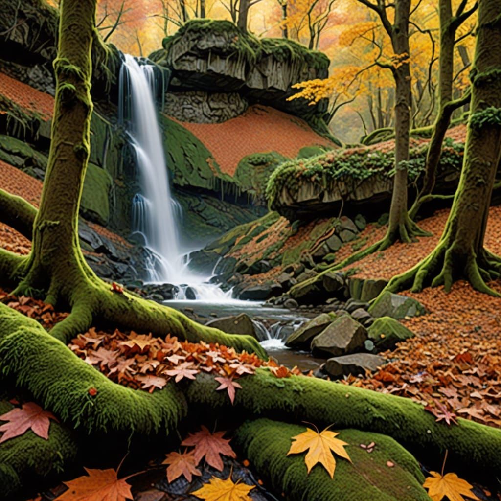 Generate your own fantasy autumn forest images for free. Easily create cozy scenes with waterfalls, oaks, maples, and more.