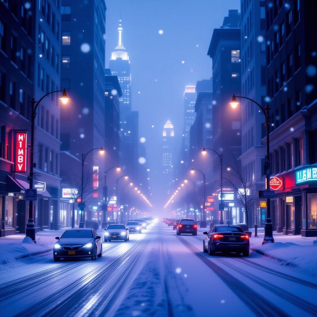 This hyperrealistic image captures a quiet, snowy city street at night. Streetlights create soft reflections in the fog, with blurred lights and subtle colors enhancing the serene winter atmosphere.