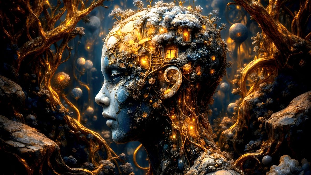 This image depicts a human head silhouette composed of intricate, interconnected rooms, presented in a blueprint cyanotype or Victorian dollhouse style with warm amber lighting. Features Escher-like spatial impossibilities.