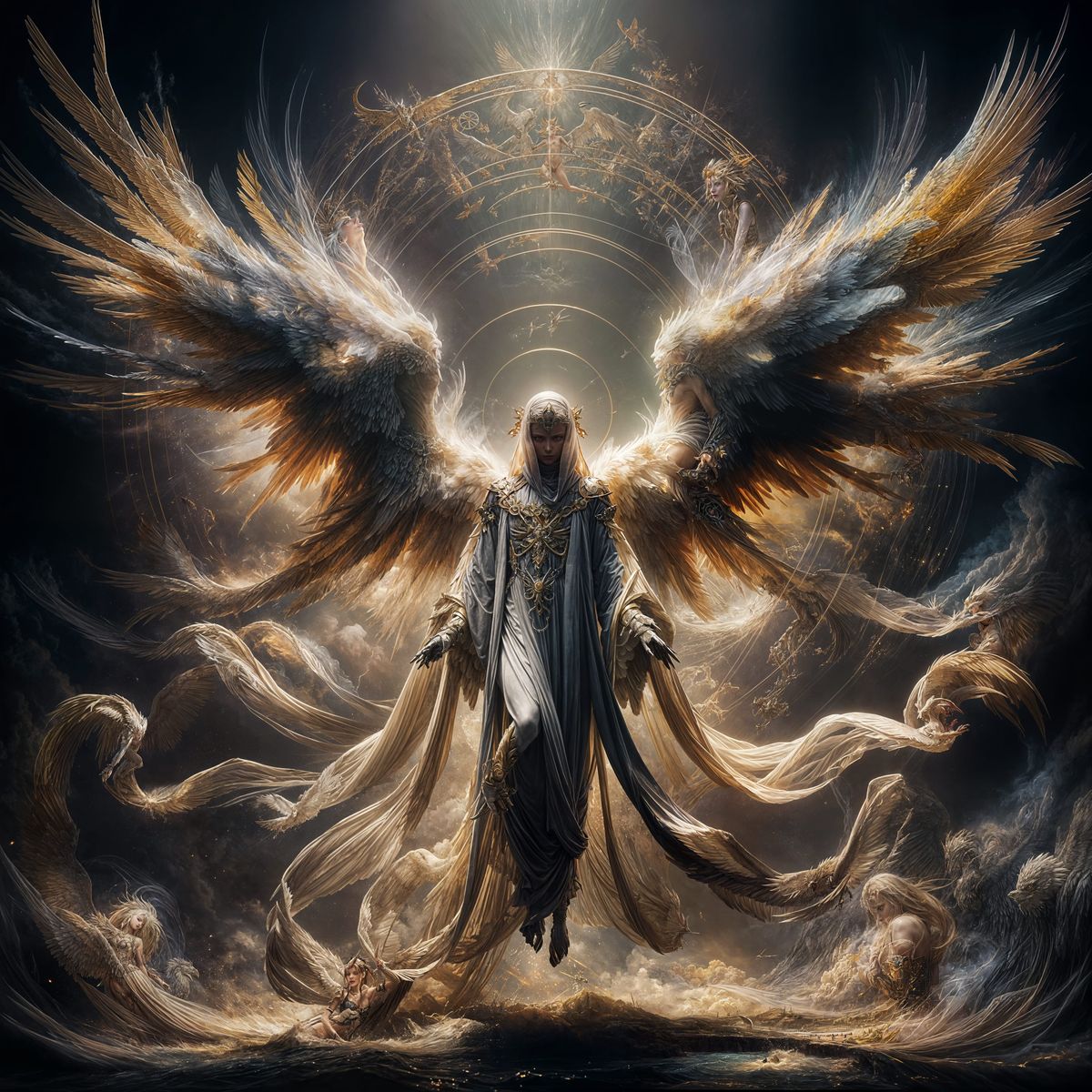 A striking picture of a celestial being inspired by Renaissance art. The figure has angel wings and flowing garments, with dramatic lighting enhancing the cinematic quality of the image.