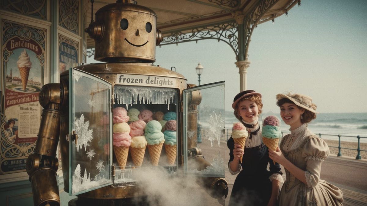 A cinematic film still shows Victorian women buying colorful ice cream cones from a smiling brass robot seller. Art Nouveau advertisements enhance this atmospheric scene.