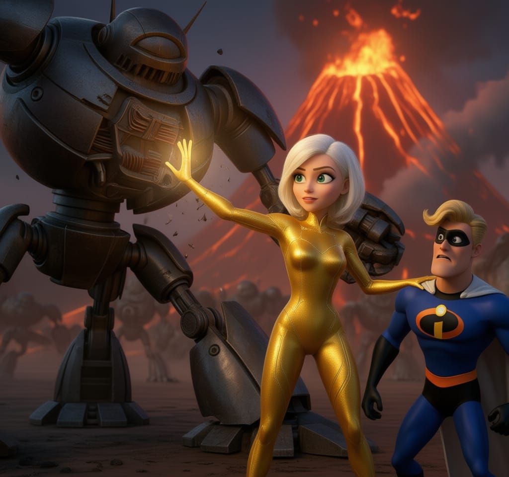 This image depicts Mirage, a silver-haired heroine, using chronokinesis to defeat Omnidroids and rescue Gamma Jack. Rendered in a Pixar-inspired style with cinematic lighting.