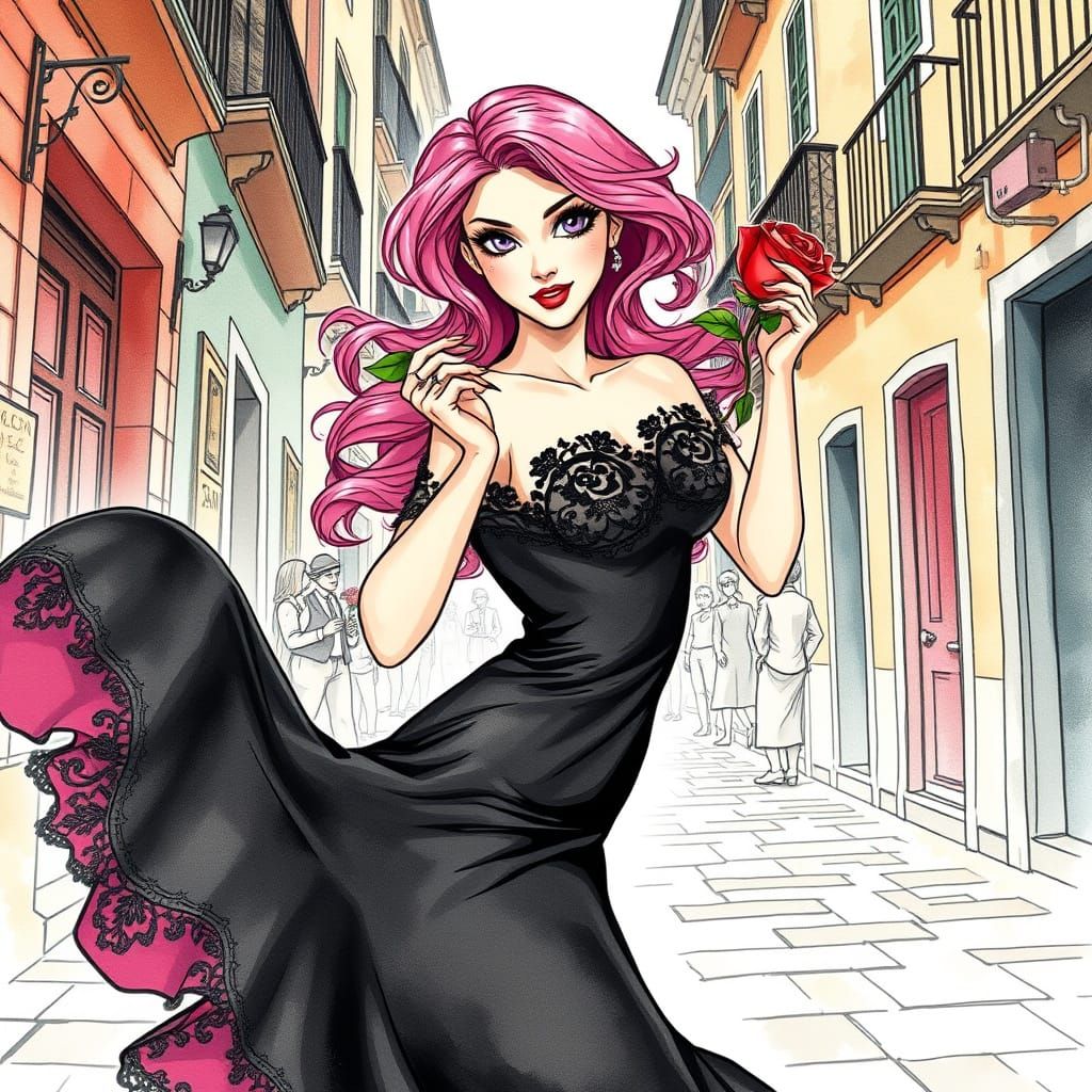 A passionate flamenco dancer in Spain, with flowing black dress and a red rose. This watercolor line art style image captures whimsical romanticism with bold lines and delicate washes.