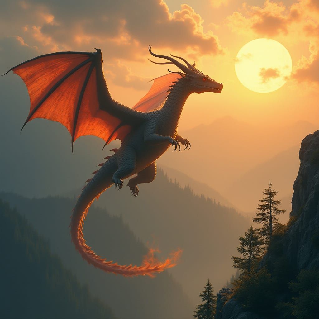 This image shows a magnificent scaly dragon in mid-flight, breathing fire as it takes off from a mountain peak overlooking a medieval village, bathed in the warm light of autumn.