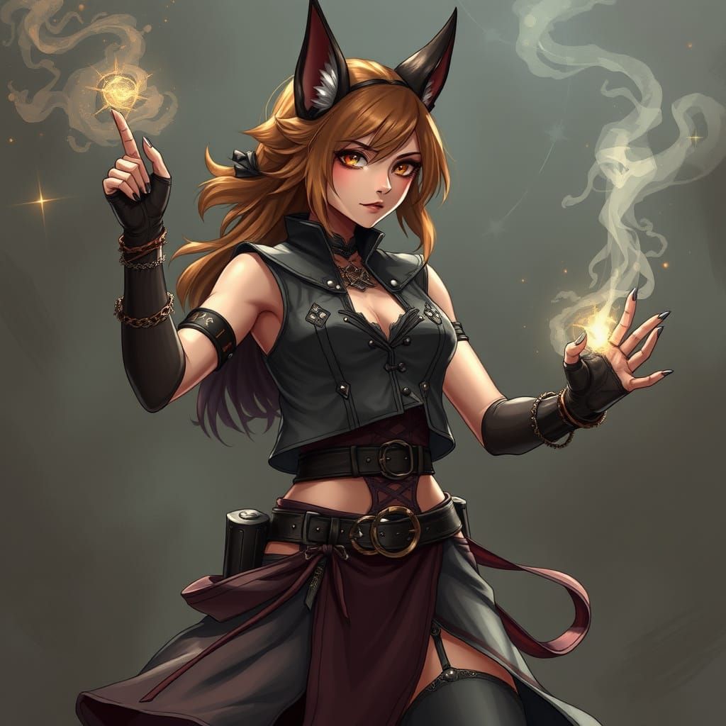 This enchanting anime-inspired image depicts a majestic, athletic female German Shepherd spell caster clad in dark, intricately designed armor and soft fabric, channeling her mystical powers with elegance and poise.