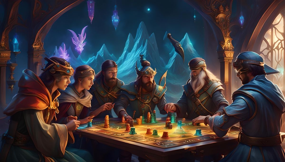 Fantasy Characters playing a Fantasy Board Game as immersive RPG gamers wearing VR headsets, in a medieval fantasy setting.