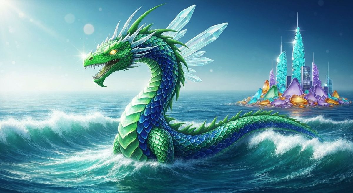 This image depicts a majestic sea dragon crafted from shimmering sea glass in emerald, cobalt, and aqua hues. It emerges from jewel-like waves, with a radiant, translucent body and crystal wings, set against a futuristic sea glass city.
