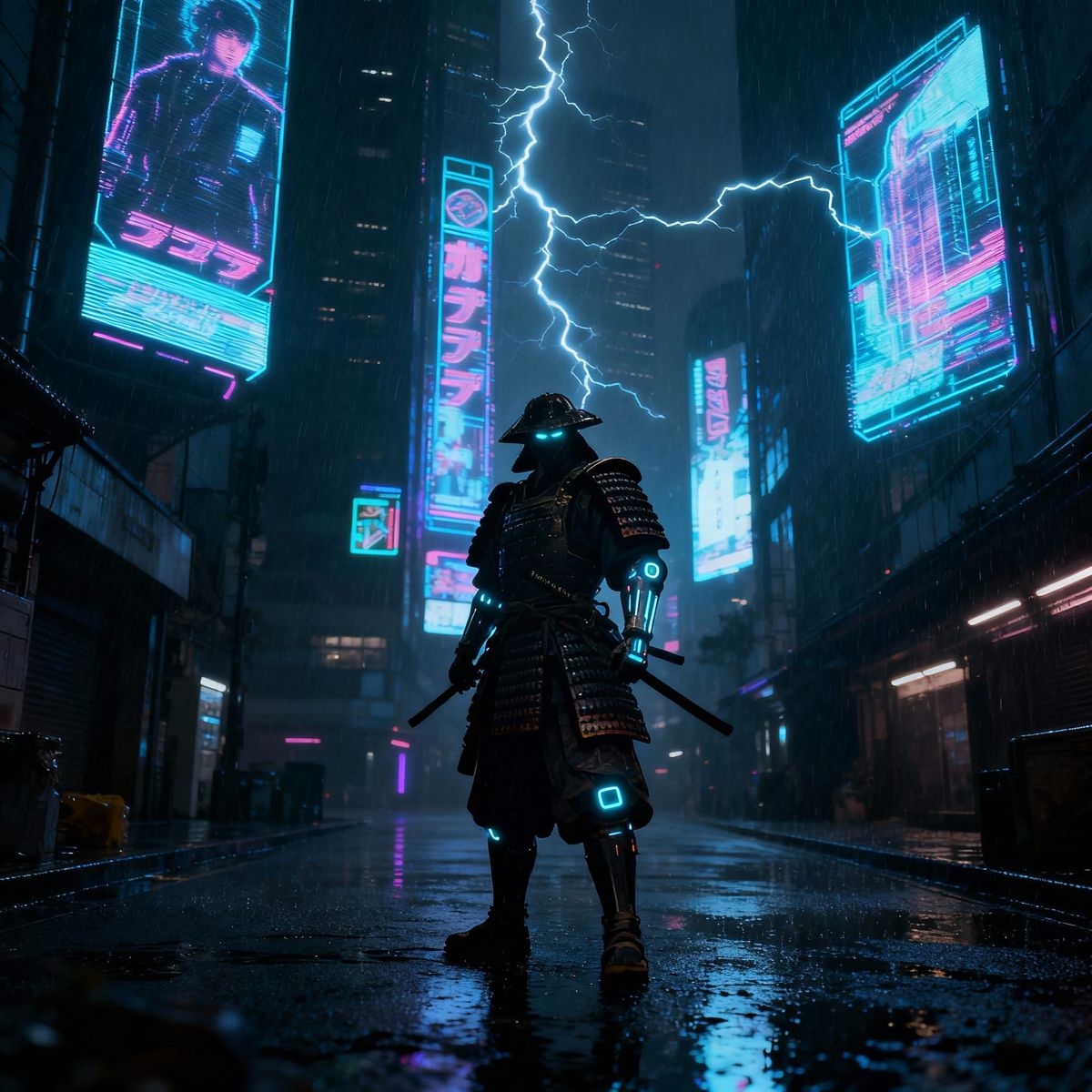 This image depicts a futuristic samurai warrior on a wet, neon-lit street. Holographic ads cast an electric glow, creating a gritty, cinematic atmosphere in a dark, detailed style.