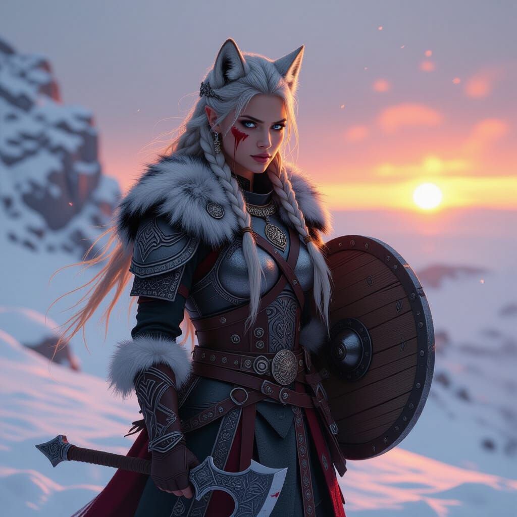 A striking picture of a wolf-like Viking shield-maiden on a snowy battlefield. She wears ornate leather and iron armor marked with Nordic runes, and wields a bloodied axe. The image features cinematic lighting and a vibrant character rendering.