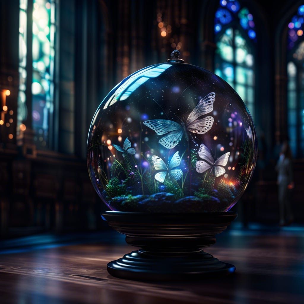 This image shows a gothic hall interior in a dark aesthetic, adorned with spherical terrariums. White butterflies glow within, rendered as holographic astral cosmic mixed media.