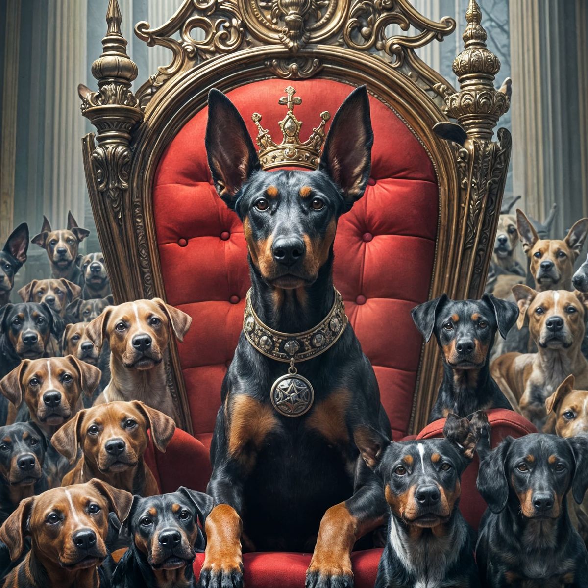 This image shows a regal Doberman Pinscher seated on a throne, observed by other dogs. The scene evokes a sense of canine royalty and hierarchy.