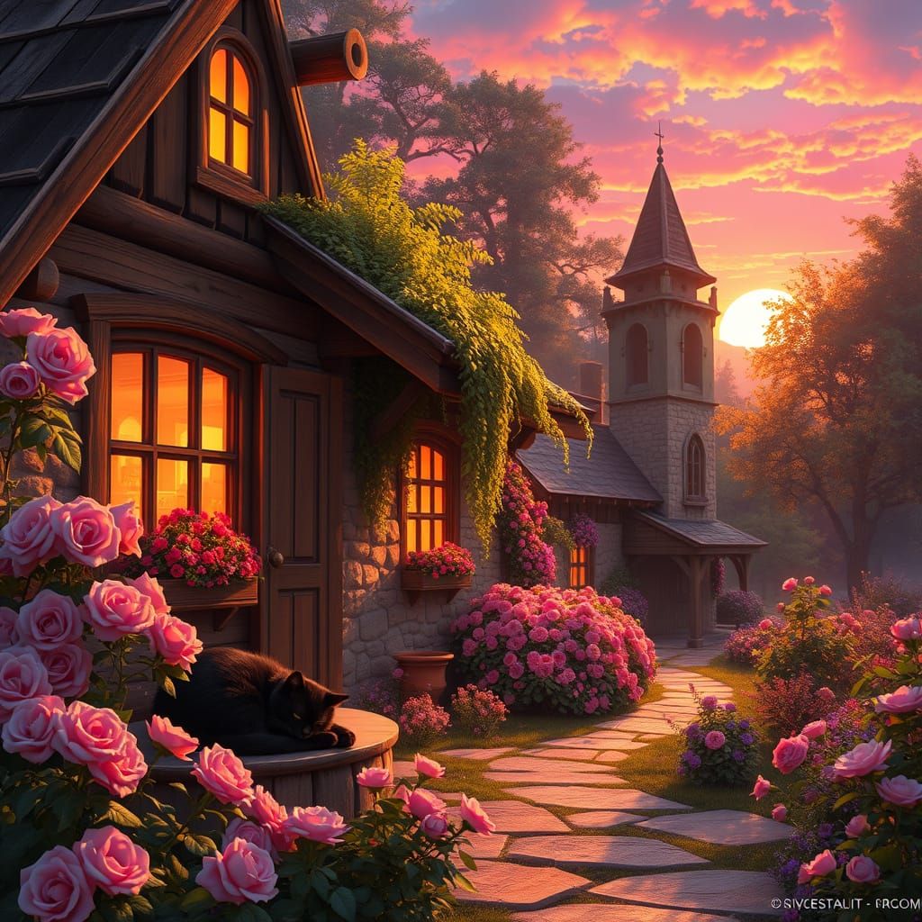 A vivid image of a cozy cottage surrounded by a rose garden at sunset. A black cat sleeps on the porch of the rustic cottage in the warm light, as a matte painting.