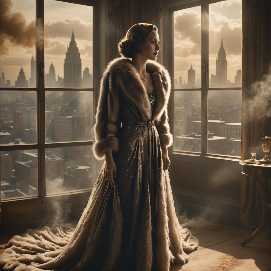 This image shows a glamorous 1930s woman in an evening gown and fur coat, posed in a smoke-filled room with a city view. Golden light and film grain enhance the Hollywood-era aesthetic.