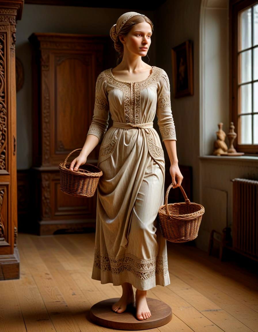 This image shows a realistic, hyper-detailed wooden sculpture of a peasant woman. The burnished face and hands contrast with the wire-brushed dress, creating a rustic yet refined aesthetic. The artist's studio is visible in the background.