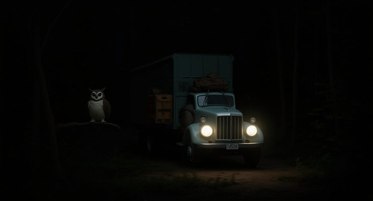 This oil painting captures a moonless evening forest scene. A light truck named The Dreamer travels with a bundle, its headlights illuminating swirling ideas, observed by an envious owl.