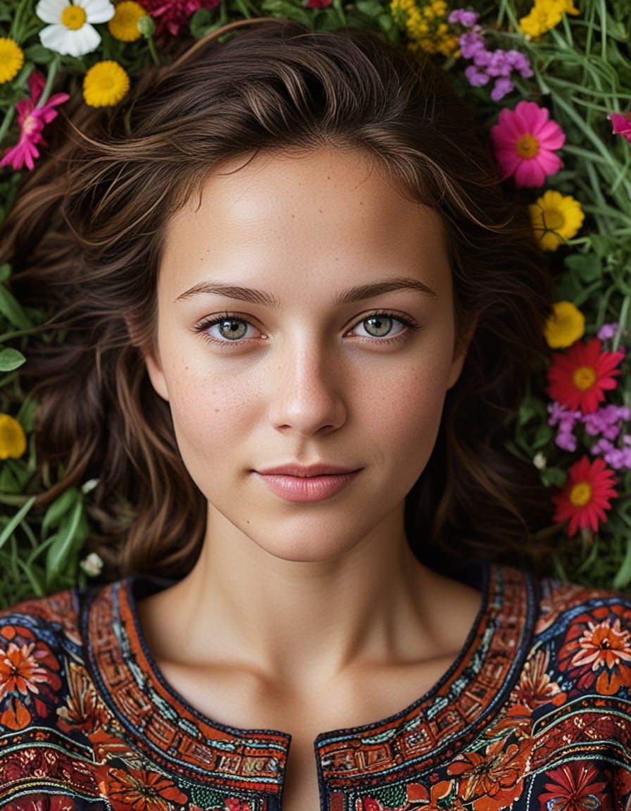 A stunning close-up portrait of a 25-year-old Swiss woman surrounded by colorful flowers in a lush mountain field, captured in sharp focus with a shallow depth of field and soft lighting, evoking a sense of serenity and connection with nature.
