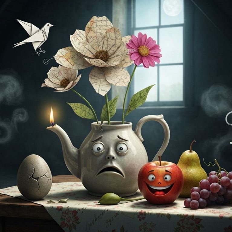 This image shows a melancholic grandfather clock in a dusty attic, with surreal floral elements and origami bird. Rendered in a dark, moody collage art style.