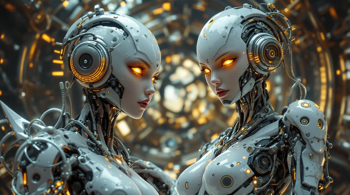 This image showcases a beautiful robotic woman with cybernetic enhancements, posed against a backdrop of steampunk-inspired clockwork. The artwork features glowing elements and realistic lighting, rendered as highly detailed digital art.