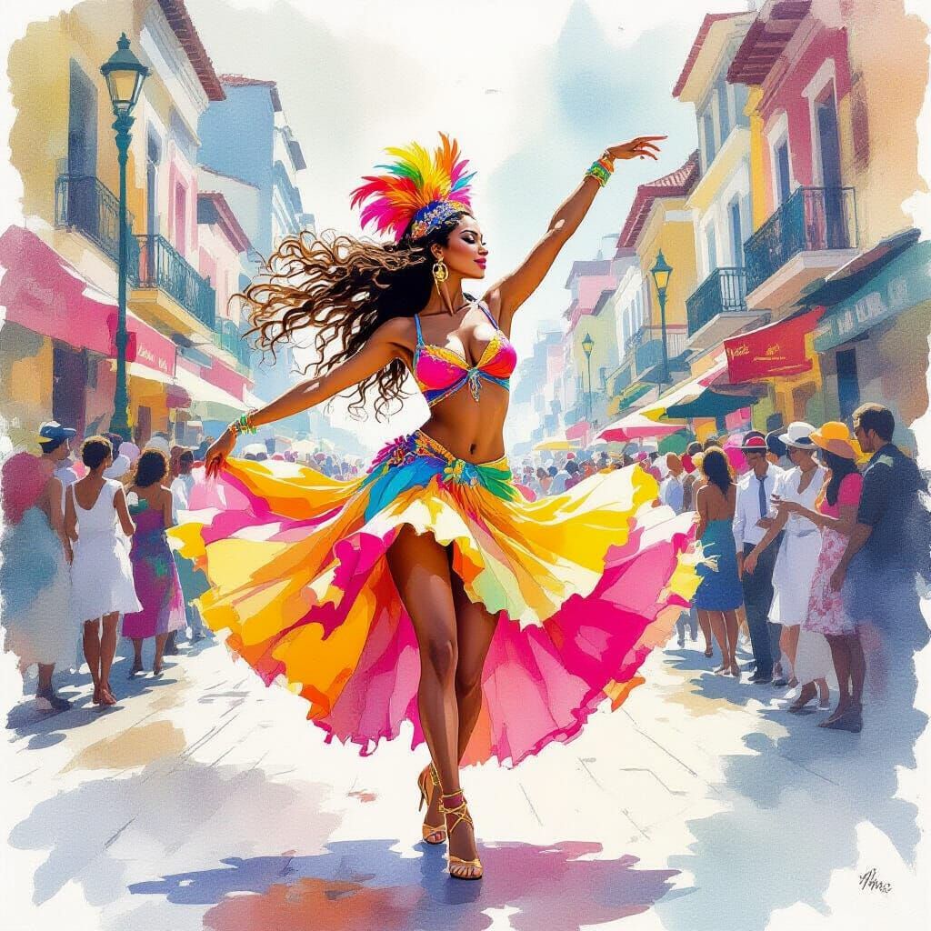 A vibrant watercolor poster of a beautiful Brazilian samba dancer in a busy Rio street during Carnival. Triadic colors create a dynamic and festive scene.