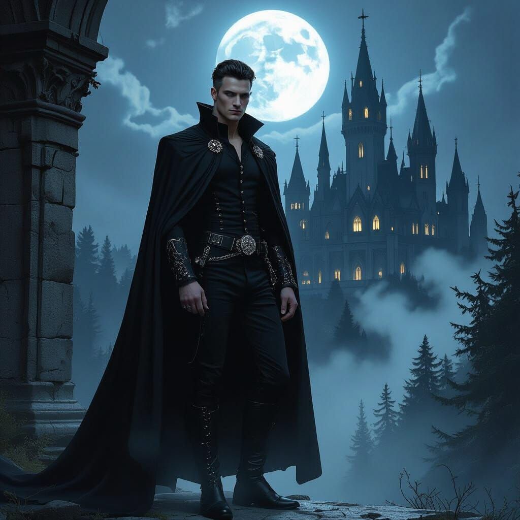 A cinematic image showing a tall, athletic man with striking features standing near a grand Gothic castle. The scene features a glowing moon, mist, and dark forest, rendered with rich textures and deep colors.