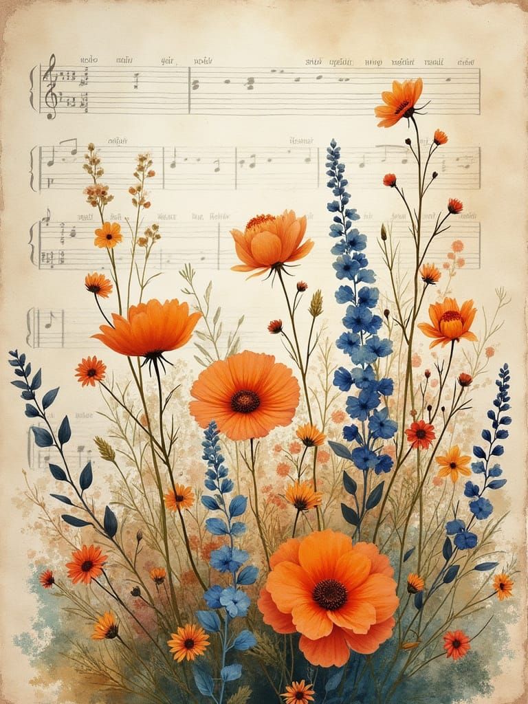 This enchanting watercolor illustration features a lush bouquet of wildflowers in rich autumn hues, set against a background of old sheet music with visible notes and aged textures. Delicate floral patterns and textures evoke a dreamy, artistic atmosphere.